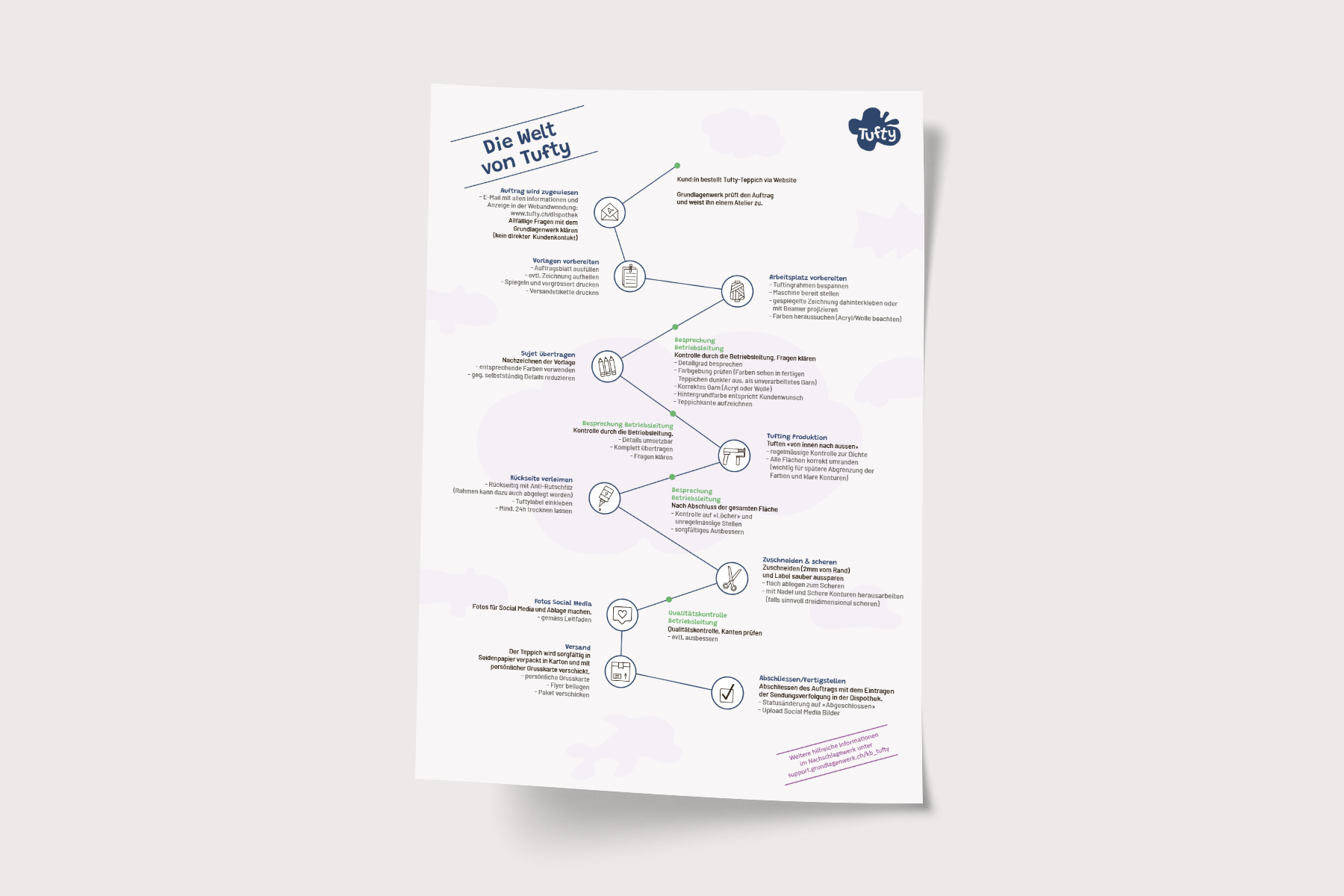 Informationsplakat für Betriebsräume und Sitzungszimmer mit Abbildung der Aufgaben und Prozesse im Tufty-Atelier. Eignet sich zur Einarbeitung neuer Teilnehmenden und bei Besichtigungen durch Zuweisende und Interessierte.