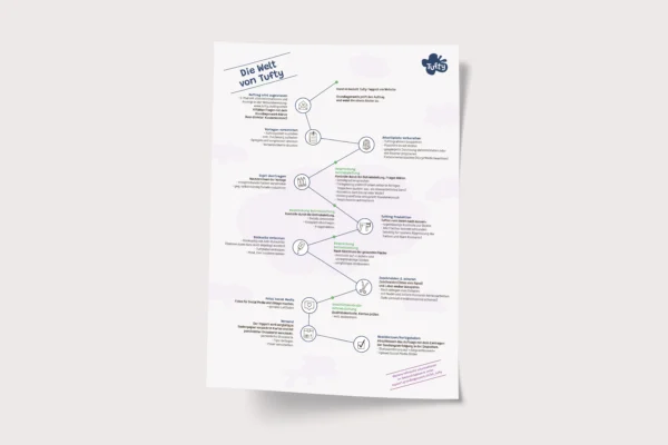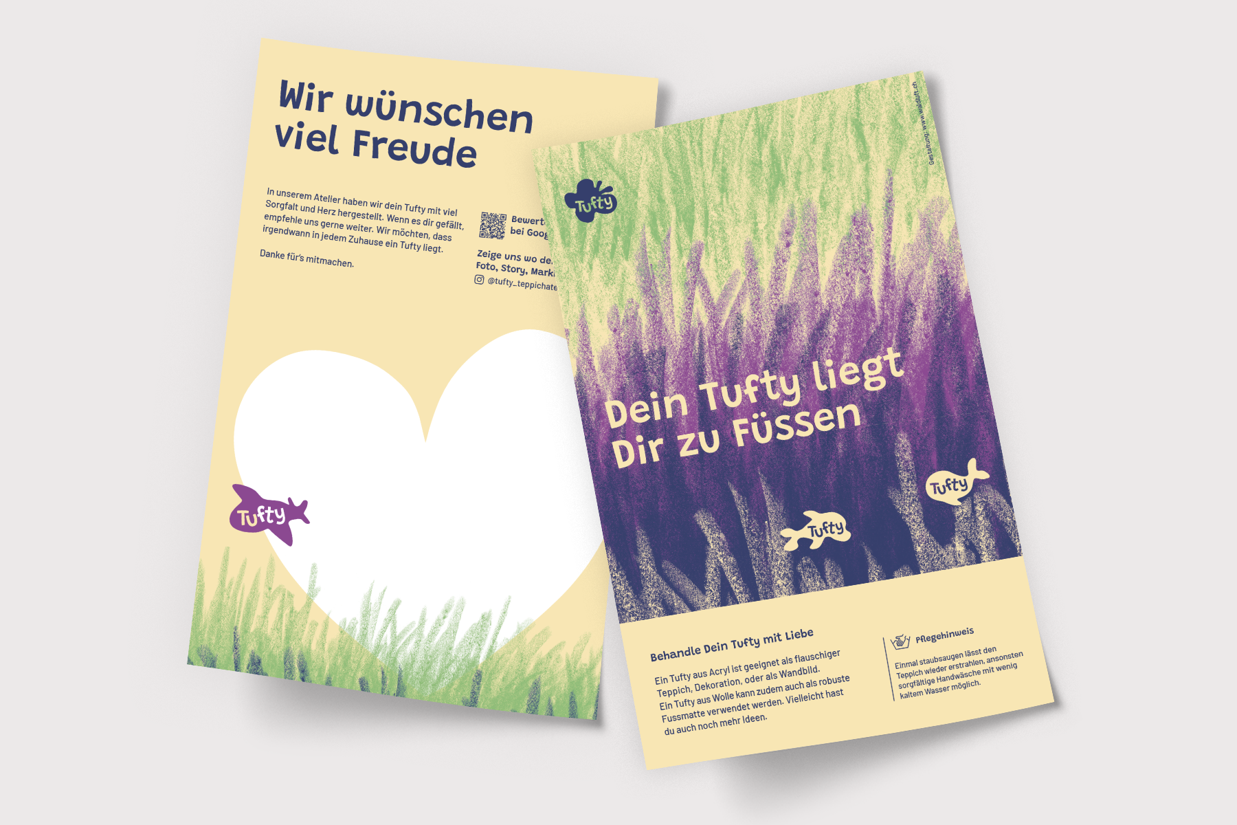 Der Flyer beinhaltet Plegehinweise und einen Aufruf das Produkt zu bewerten. Auf der Rückseite gibt es im Herz freien Platz einen kurzen Gruss an die Kund:in zu schreiben. Der Flyer wird einer Bestellung in die Verpackung dazugelegt.