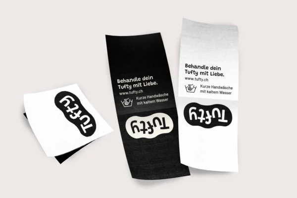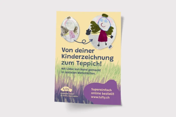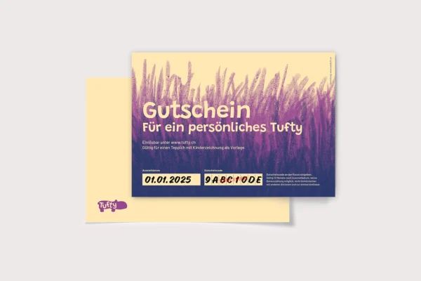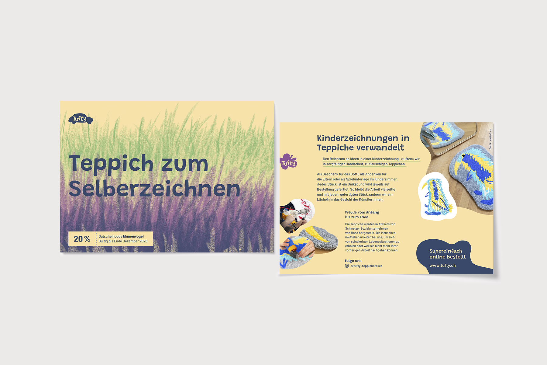 Der Werbeflyer Tufty ist für Kund:innen gedacht und erklärt kurz und kompakt die Dienstleistung und die Hintergründe zur Marke. Auf der Vorderseite ist ein Gutscheincode abgedruckt, damit erhalten Kund:innen 20% Rabatt im Onlineshop.